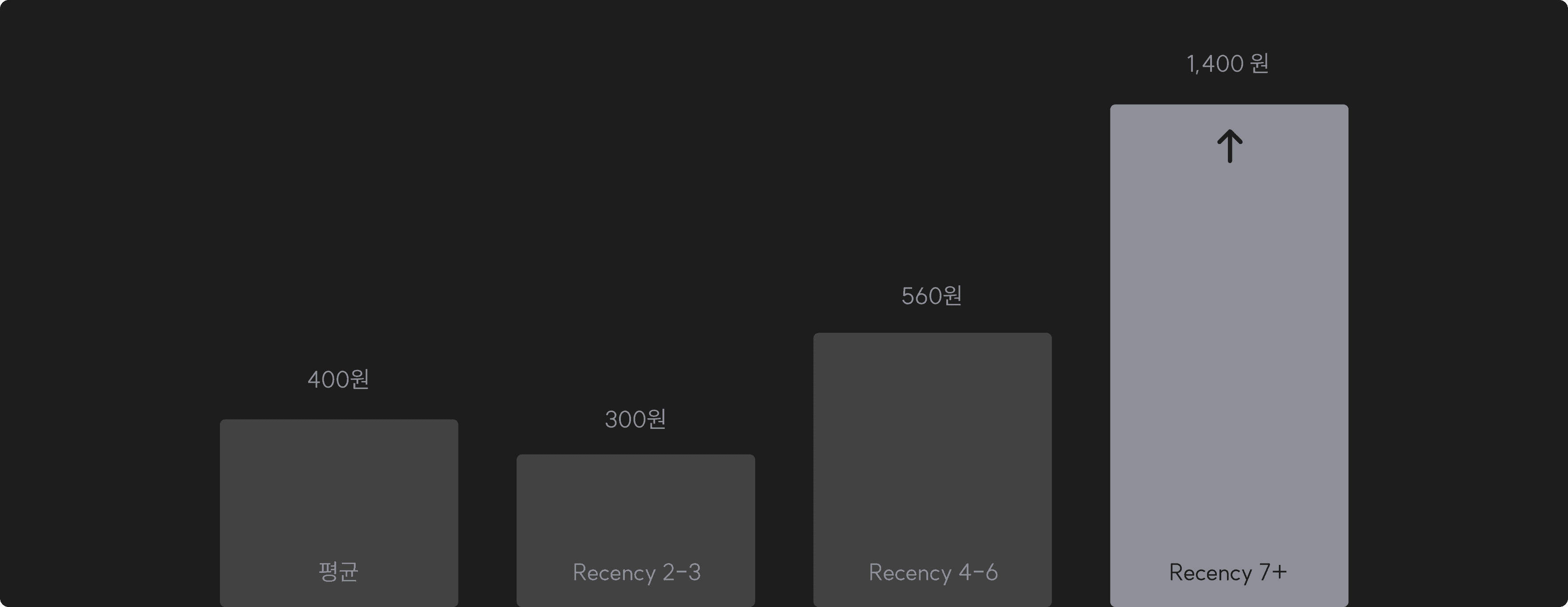 Recency 7m+ 이상의 유저를 복귀시키려면 1,400원 이상의 비용이 필요하며 시간이 갈수록 CRM에 반응하는 부활 유저의 비율이 줄어든다