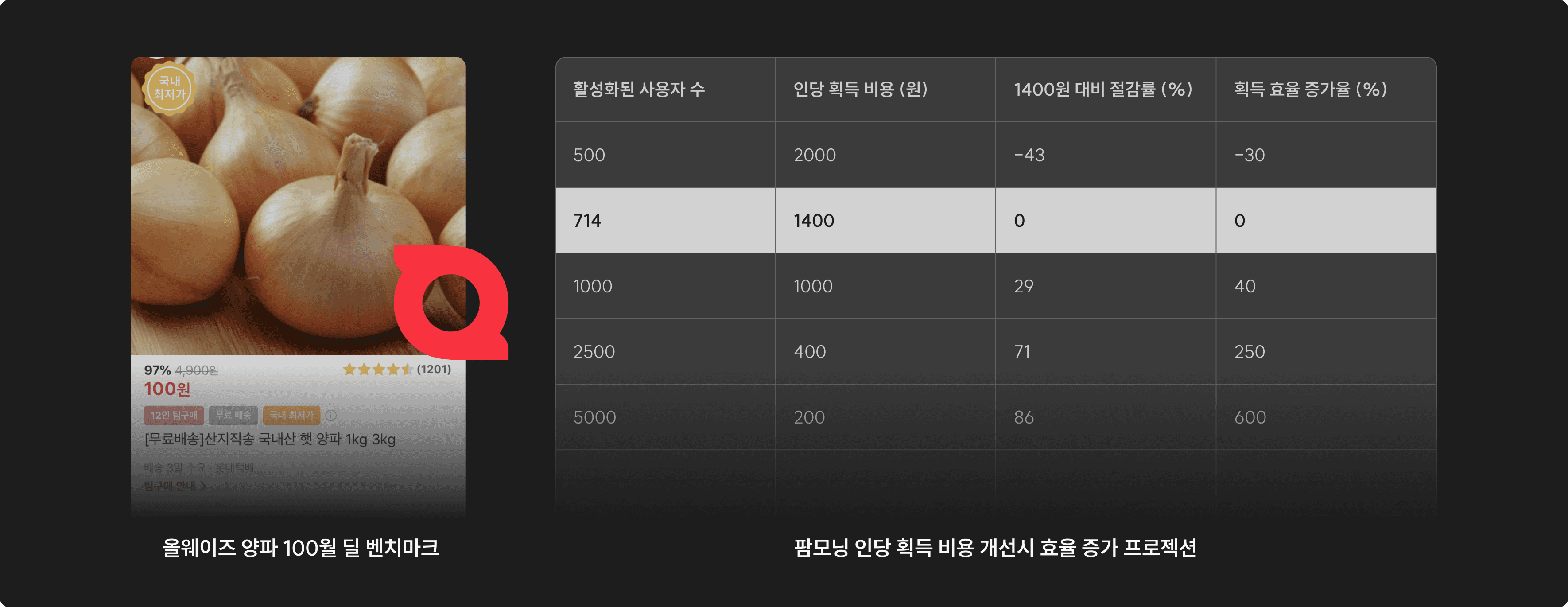 유저 복귀를 위해 '올웨이즈의 양파 100원 딜 이벤트'에서 힌트를 얻었다. 쉽게 설명하자면, 양파가 4,900원인데 올웨이즈의 신규 유저 획득 비용이 7,000원이라면 4,800원을 할인해주고 100원에 판매하였을 때 (Paid 집행 없이 Organic-Viral으로만) 유저 획득이 더 효율적으로 가능한가에 대한 실험이었다.