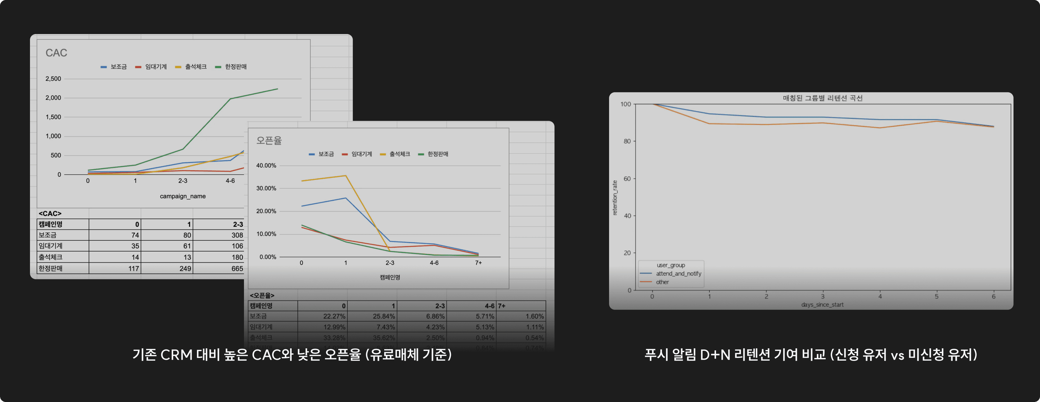 수량한정판매 실험 결과 Recency 0m 유저가 6.7만 명 참여하며, 푸시 오픈율은 평균 대비 2.7배 우수했으나 Chured 유저를 Resurrected시키는 데에는 실패했다. 긍정적이었던 점은 실험 설계 단계에서 캠페인에 반응하는 유저를 극대화하기 위해 넣었던 장치인 '알림 신청'으로 인해 이벤트 기간 7일 동안 D+N 리텐션에는 크게 기여했던 것을 확인할 수 있었다.